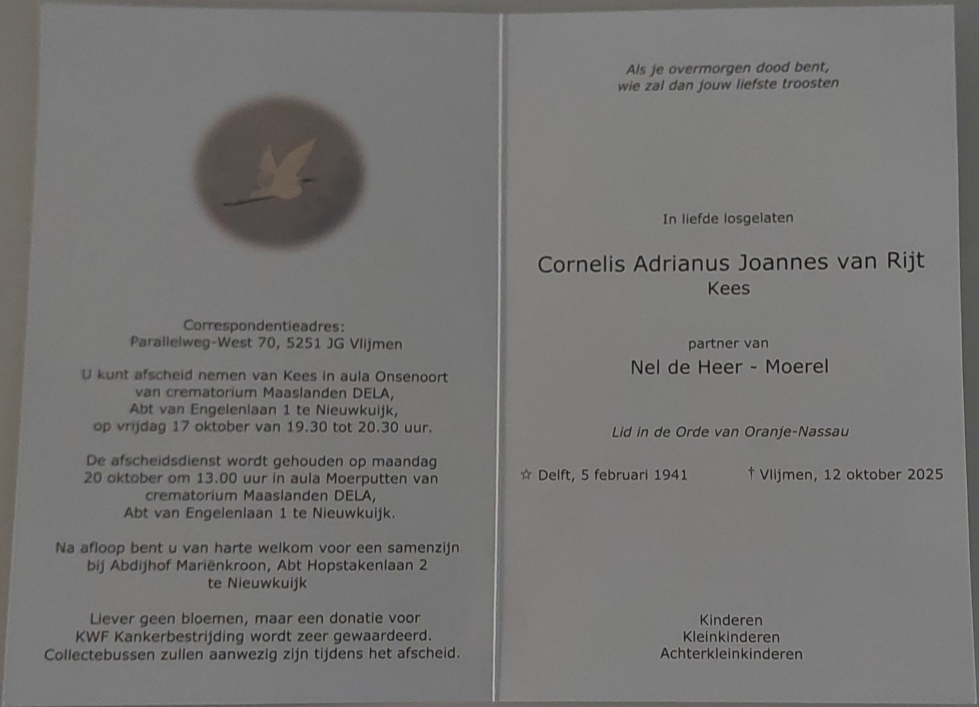 Kees heeft op zondag, 12 oktober 2025 afscheid van het leven genomen. Wij zullen hem zeker missen.